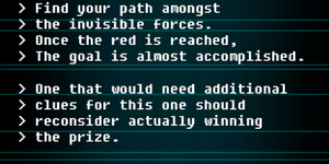 Find your path amongst the invisible forces. Once the red is reached, the goal is almost accomplished. One that would need additional clues for this one should reconsider actually winning the prize.
