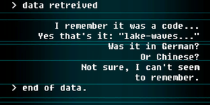 I remember it was a code... Yes that's it: "lake-waves..." Was it in German? Or Chinese? Not sure, I can't seem to remember.