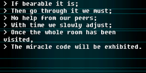 If bearable it is; Then go through it we must; No help from our peers; With time we slowly adjust; Once the whole room has been visited, The miracle code will be exhibited.