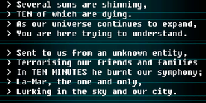 4 bakar Several suns are shinning, TEN of which are dying. As our universe continues to expand, You are here trying to understand. Sent to us from an unknown entity, Terrorising our friends and families In TEN MINUTES he burnt our symphony; La-Mar, the one and only, Lurking in the sky and our city.
