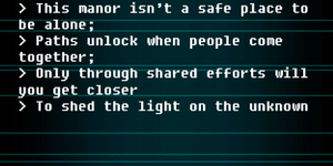 This manor isn't a safe place to be alone; Paths unlock when people come together; Only through shared efforts will you get closer To shed the light on the unknown