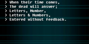 When their time come, The dead will answer; Letters, Number, Letters & Numbers, Entered without feedback.