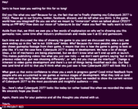 That Monday, on August 27, CDPR began broadcasting the Base64 encoded text on their [https://www.twitch.tv/videos/302423092 Twitch channel]. Soon after, they gave a [https://www.youtube.com/watch?v=vjF9GgrY9c0 48 min walkthrough of the gameplay of Cyberpunk 2077]. | That Monday, on August 27, CDPR began broadcasting the Base64 encoded text on their [https://www.twitch.tv/videos/302423092 Twitch channel]. Soon after, they gave a [https://www.youtube.com/watch?v=vjF9GgrY9c0 48 min walkthrough of the gameplay of Cyberpunk 2077]. | ||