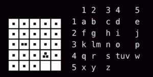 While the contacts and mail files set the scene the Greek writing in the background of the poster and the contents of 0001.txt pointed players to attempt use of a Polybius square. The arrangement of black dots in white squares in the bottom right corner gives the set up for a non-standard Polybius square which, given the digits in 000.txt, decodes to multiple possible solutions.