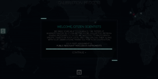 In order to proceed, we'd like you to do something somewhat more complex: calibrating the simulation process you've started at wakingtitan.com. This is, again, a collaborative task. Consider it a getting-to-know-you mission; the computer is getting to know you as a community. Participating is simple. To begin with, we need you to take and upload photographs of public resonant percussion instruments in your locality -- church bells or wind chimes, for example. We'll also need you to answer a few simple questions about the experience of taking the photograph.