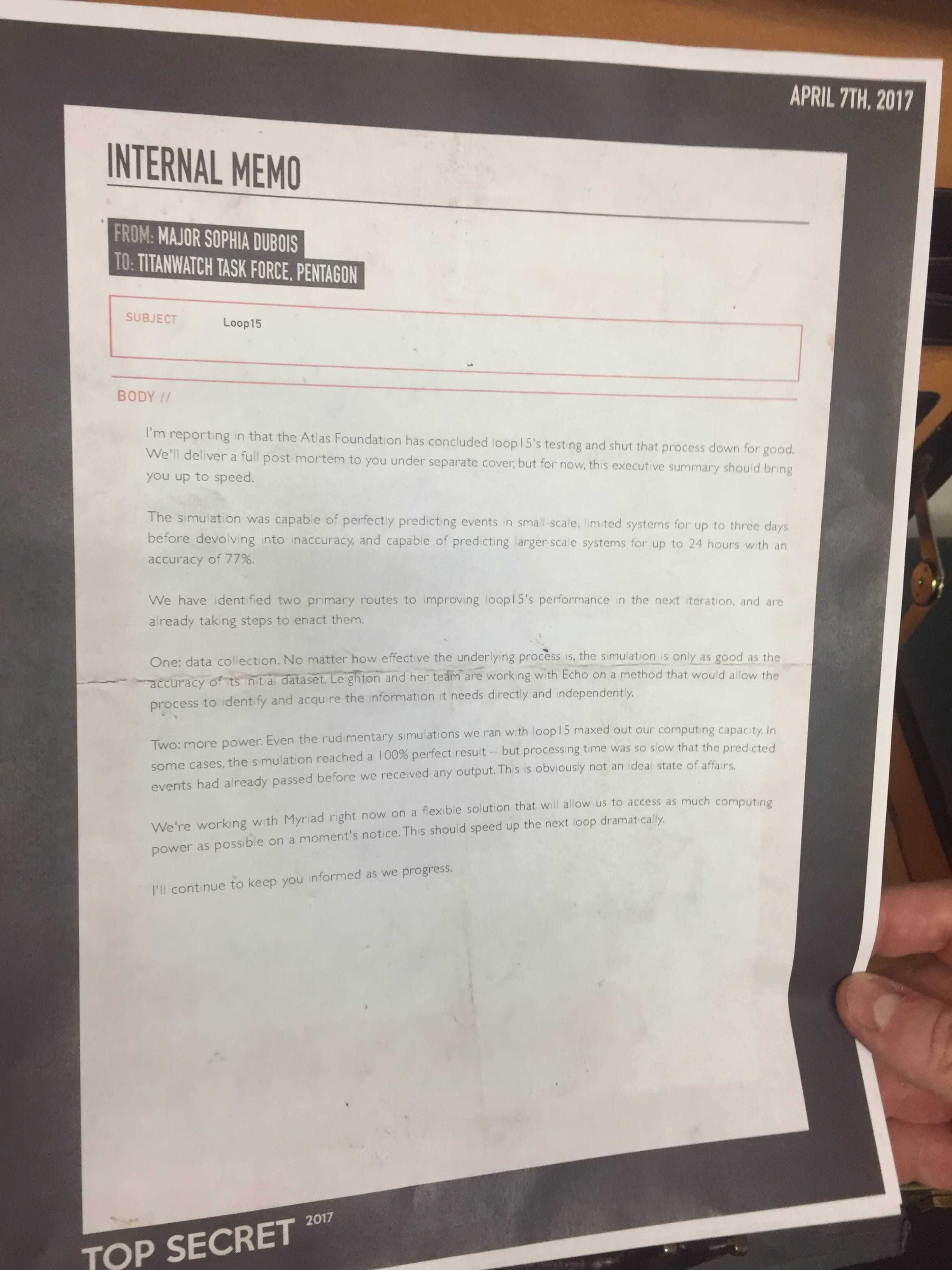 Memo from Major Sophie Dubois on Loop15.