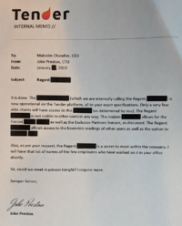 The censored Tender document was a memo from CTO Jobe Preston to CEO Malcolm Chandler, discussed something known as the "Regent [censored]", which only "a very few elite clients will have access to" and "allows access to the biometric readings of other users". It also mentions this is a secret to most within Tender itself, with only a small number of employees aware of it.