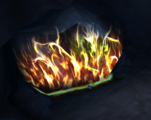 The first puzzle players encounter in the Cave of Consumption consists of two elemental barriers: a fire barrier, and a fel barrier. By using a Major Fire Protection Potion, players are able to pass through the fire barrier unhindered. Since fel magic is comprised of all schools of magic, the fel barrier can be bypassed by drinking the other 5 types of Major Protection Potions (Arcane, Frost, Holy, Nature, and Shadow).
