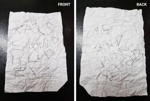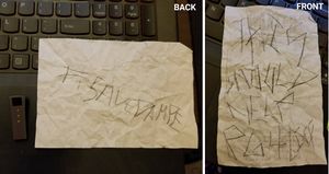 - ru received 1.mp3 and a note with "THIS SHOULD HELP RU" (front) and "P.S. SEND MORE PENCILS" (back).