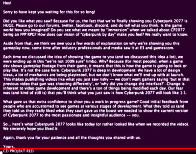 Players captured the video recording during the broadcast and extracted images periodically to gather most of the data. Using OCR (optical character recognition) on each image, and eliminating any duplicate lines, The image was decoded. The image was a screenshot of the beginning of the gameplay demo showing the closed elevator. So far, a difference comparison shows little discrepancy besides the overlay on the top of the frame. The only other thing of note aside from the gameplay itself was a frame hidden by CDPR right after the gameplay, pictured left, which included a few paragraphs explaining the stream and CDPR's motives, thoughts, etc.