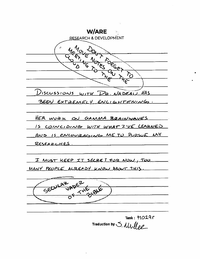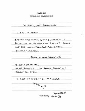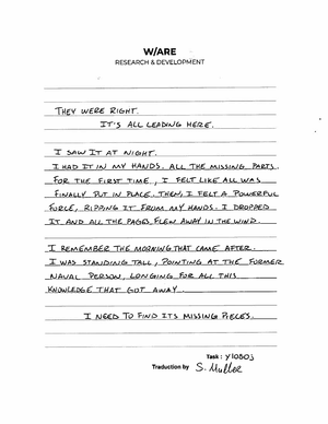 Attention to all teams. Documentation (copies and originals) coming from a source close to the missing employee have been recovered by W/ARE. There are a lot of files to organize and our database employees are still trying to get everything in order. Any information that could help us make sense of them will be most welcome.