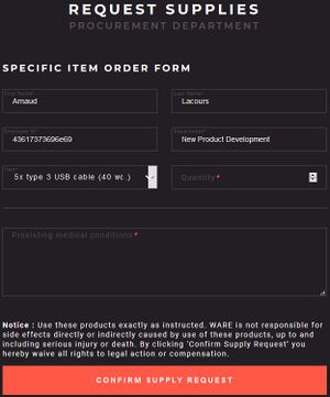 The WARE Developer Area was accessed using the credentials [email protected] / f1orbiag55z1. Initially, it contained a main page, a developer profile page and multiple inaccessible pages. The main page presented an overview of user statistics and an empty main WARE token wallet. Alongside the empty wallet were 12 wallets labelled Alpha-Lima in the NATO Phonetic alphabet, each containing 256 WARE. The Documents and Task Manager pages were inaccessible due to Arnaud Lacours' account having an insufficient clearance level. The Request Supplies page was inaccessible due to insufficient funds (where funds are probably WARE tokens). Accessing the developer profile page while authenticated as Arnaud Lacours showed their information; including a phone number: (514) 448-1493. When this number was originally called, it led to a voicemail message in French, translated to English it said: