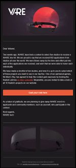 At 19:51 UTC, players who had applied for a Developer Kit started receiving emails with further details on what kind of applications W/ARE were looking for. According to this email, the company had opened positions for five partnered studios, one of which would also receive a grand prize of $1,000 USD. The deadline for applications was April 28th.