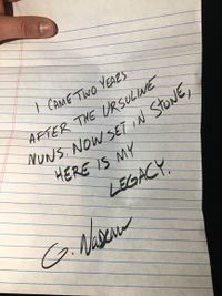 At the drop location, players received the following note: I came two years after the Ursuline nuns. Now set in stone, here is my legacy. G. Nadeau